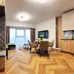 Geniet van een keuken in Olszynki Park Luxury Residence met een waterkoker, een koelkast en keukengerei voor uw gemak. De Kopisto Most Zamkowy 04 bushalte is binnen 5 minuten te voet ervan gesitueerd.